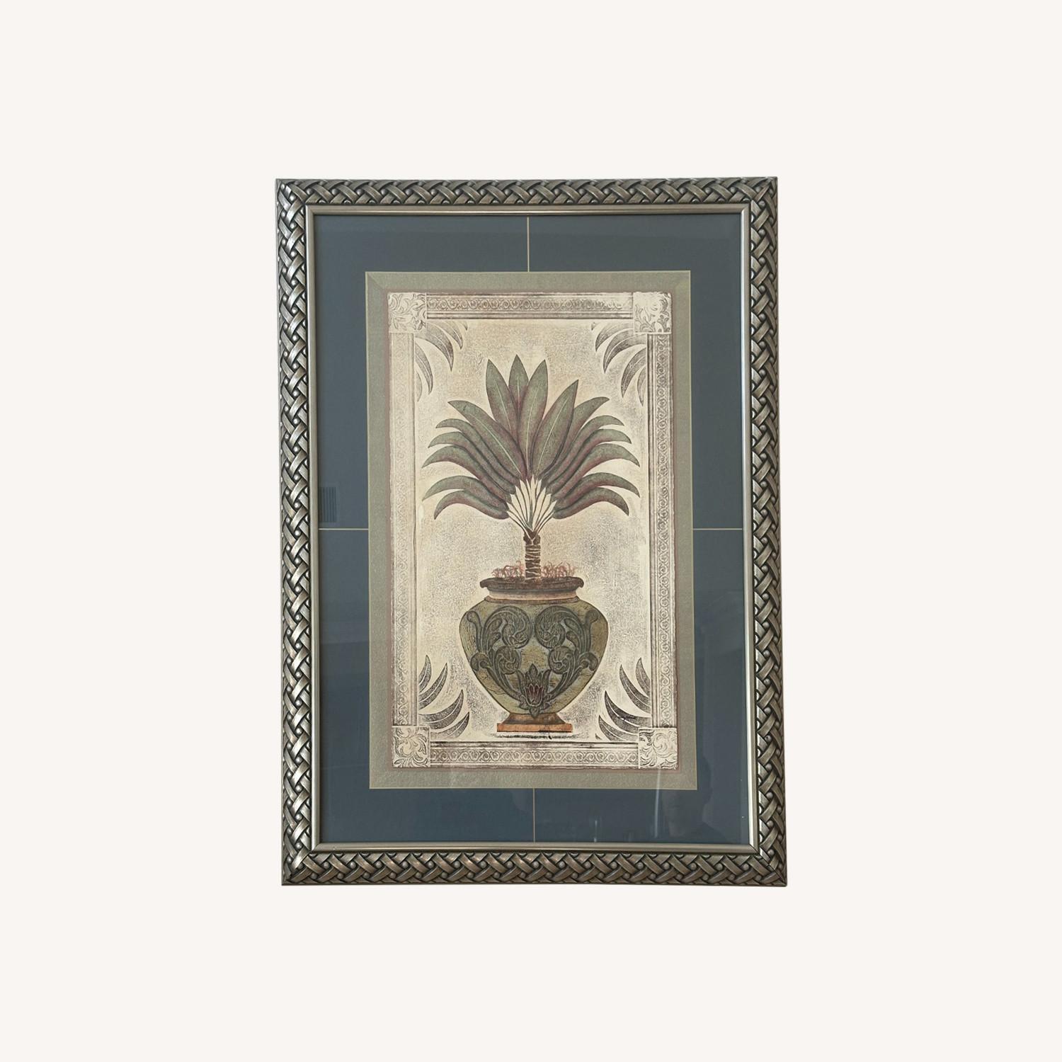 Seller's Notes:A large, statement piece of wall art featuring a lush, traditional botanical illustration ( palm/banana leaf in an urn). The ornate silver/metallic woven-look frame and decorative matting make it an upscale piece for a living room, bedroom, or foyer. Style: tropical/traditional botanical Frame: oversized silver/metallic finish, woven