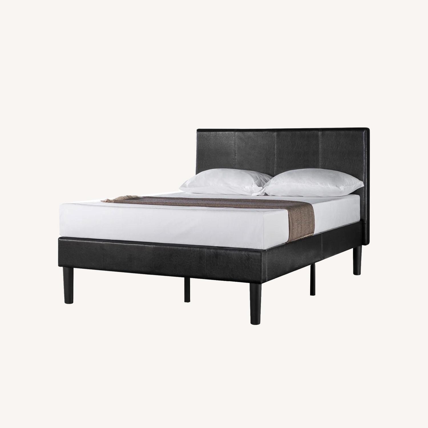 Seller's Notes:This platform bed brings a modern, minimalist style to your bedroom. Made from metal and engineered wood with an espresso finish, it's wrapped in faux leather upholstery for a sleek feel. It boasts a rectangular panel headboard with clean lines and a simplistic style. The headboard is stuffed with foam, giving you cushioning to lean against as you read before sleep. We love how the neutral hue easily works with many color schemes and patterns. This bed frame has center legs that provide additional support. Best of all, a box spring is not necessary – just add a mattress (sold separately).