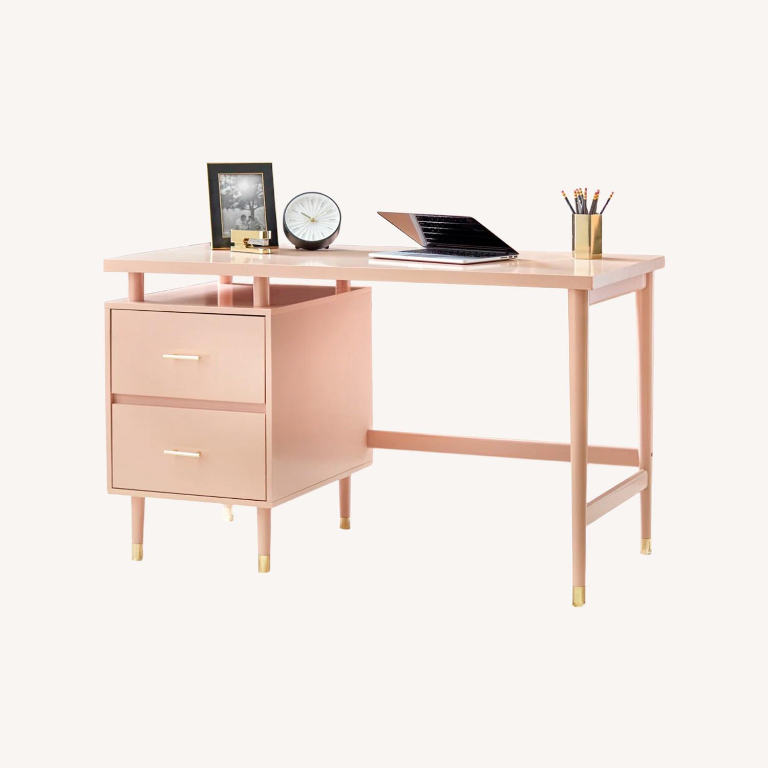 This computer desk is the dream home for all your office essentials. It's crafted from engineered wood with solid wood dowel legs in your choice of finishes. It features two drawers that stand beside an open space for a desk chair, giving this desk a cool, asymmetrical look. These drawers slide easily on metal roller glides, and they feature sleek bar pulls in a gold finish. Above the drawers, an open shelf with a distinctive, pillared design sits just under the desktop. The detail we love: Metal-capped feet add a mid-century-inspired touch that's trending right now.