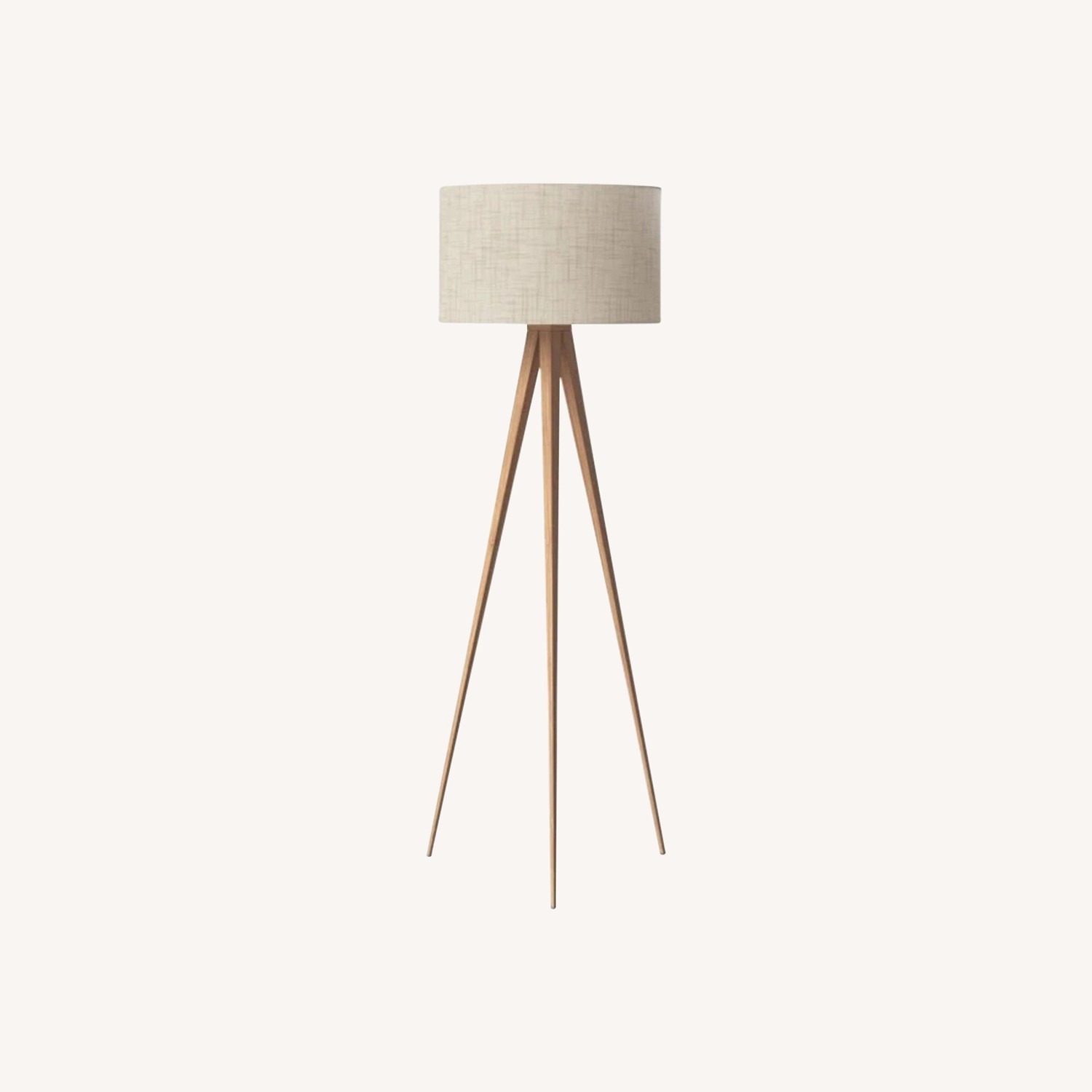 Seller's Notes:This tripod floor lamp draws on a silhouette that's inspired by mid-century style and shows off a warm wood grain for a Scandinavian vibe. The base features tapered legs crafted from engineered wood, and it comes with a clean-lined linen drum shade for a minimalist look. It accommodates a 150W max bulb, which is sold separately and controlled by a handy 3-way switch. Plus, a 72'' cord means that even if your outlet is far away, you can still easily plug this lamp in. Good condition, tiniest bit off centre.