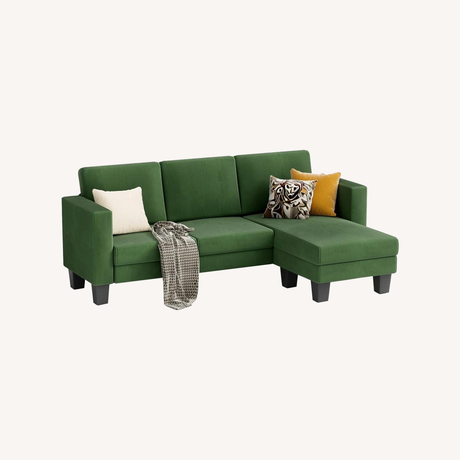 Green corduroy fabric with an ottoman and removable cushions for washing.