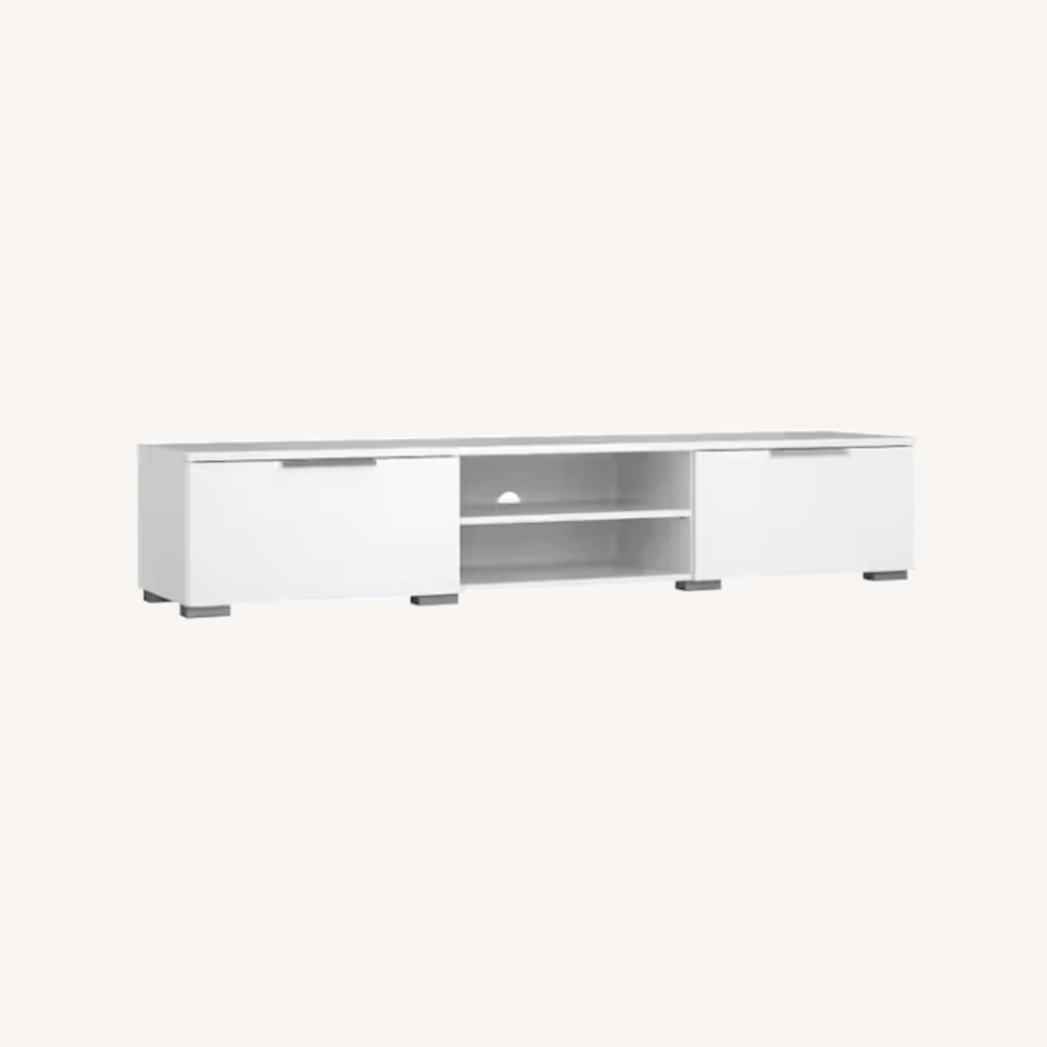 This contemporary TV stand brings modern style and minimalist design to your space. Crafted from engineered wood, it measures 67.99'' wide and accommodates TVs up to 78''. Its clean-lined silhouette showcases two open shelves for your entertainment systems and books. Two drawers with sleek metallic pulls offer storage space for board games and extra blankets. Plus, a cable management cutout on the back easily hides wires. A wall anchor is included for added safety.