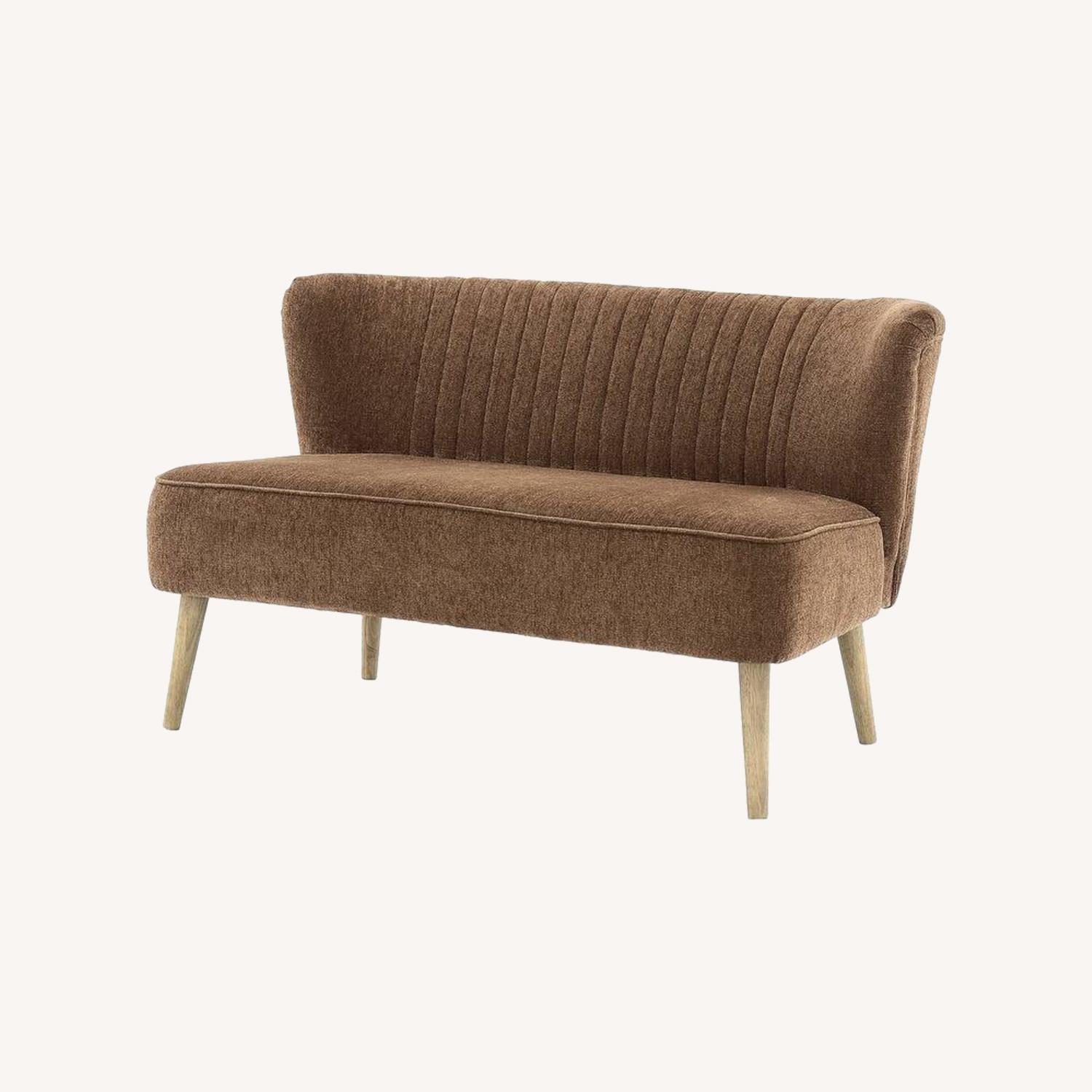 Seller's Notes:The Collbury settee boasts couture-inspired detailing with its curved sides and contemporary/mid-century allure. Channel stitched back design with natural wood tapered legs elevates its luxe appeal with feel-good cognac brown colored polyester fabric putting comfort in style. Beige polyester upholstery Wood legs with natural finish Attached back and seat cushion