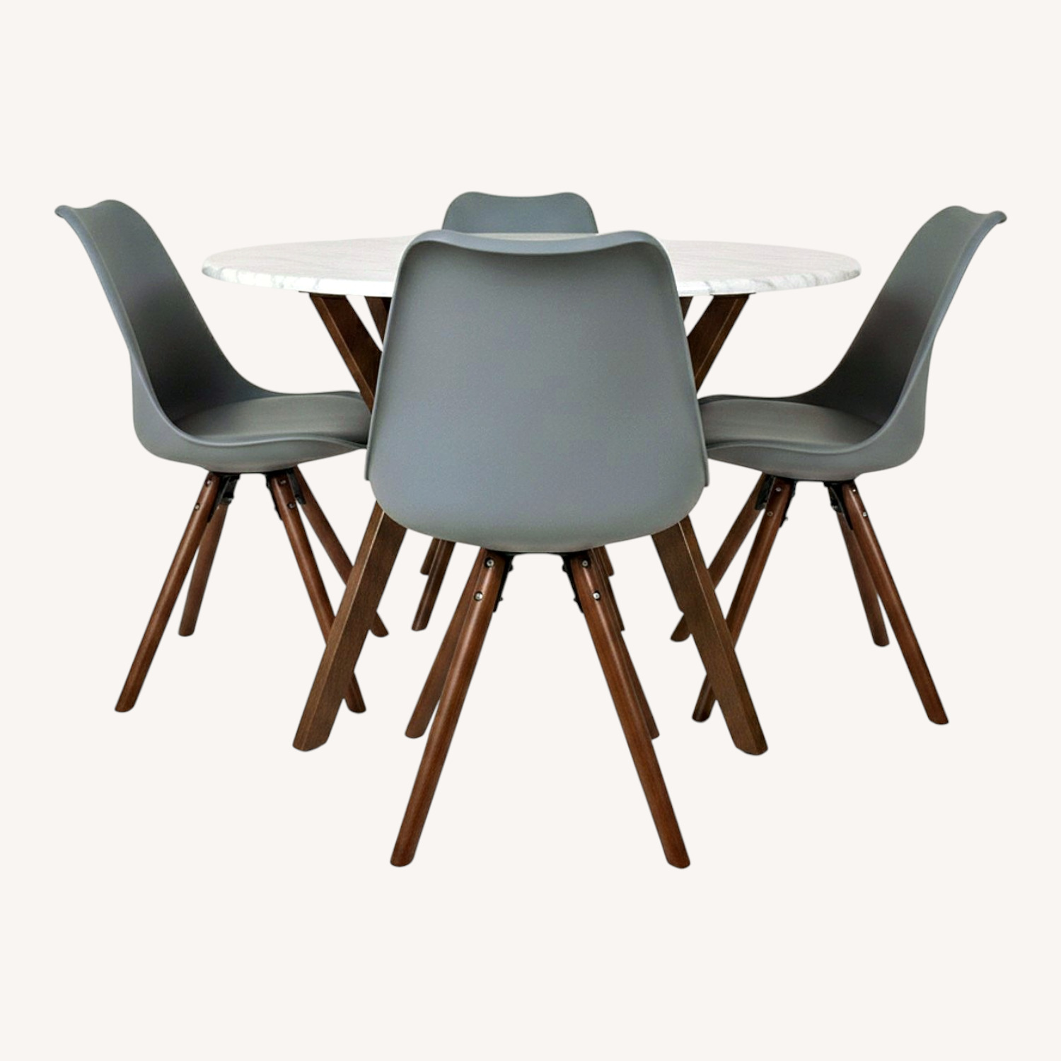 Seller's Notes:Great condition mid-century modern round dining table set. Marble look top that is scratch-resistant and easy clean. Four matching grey cushioned dining chairs, all with walnut wood base.
