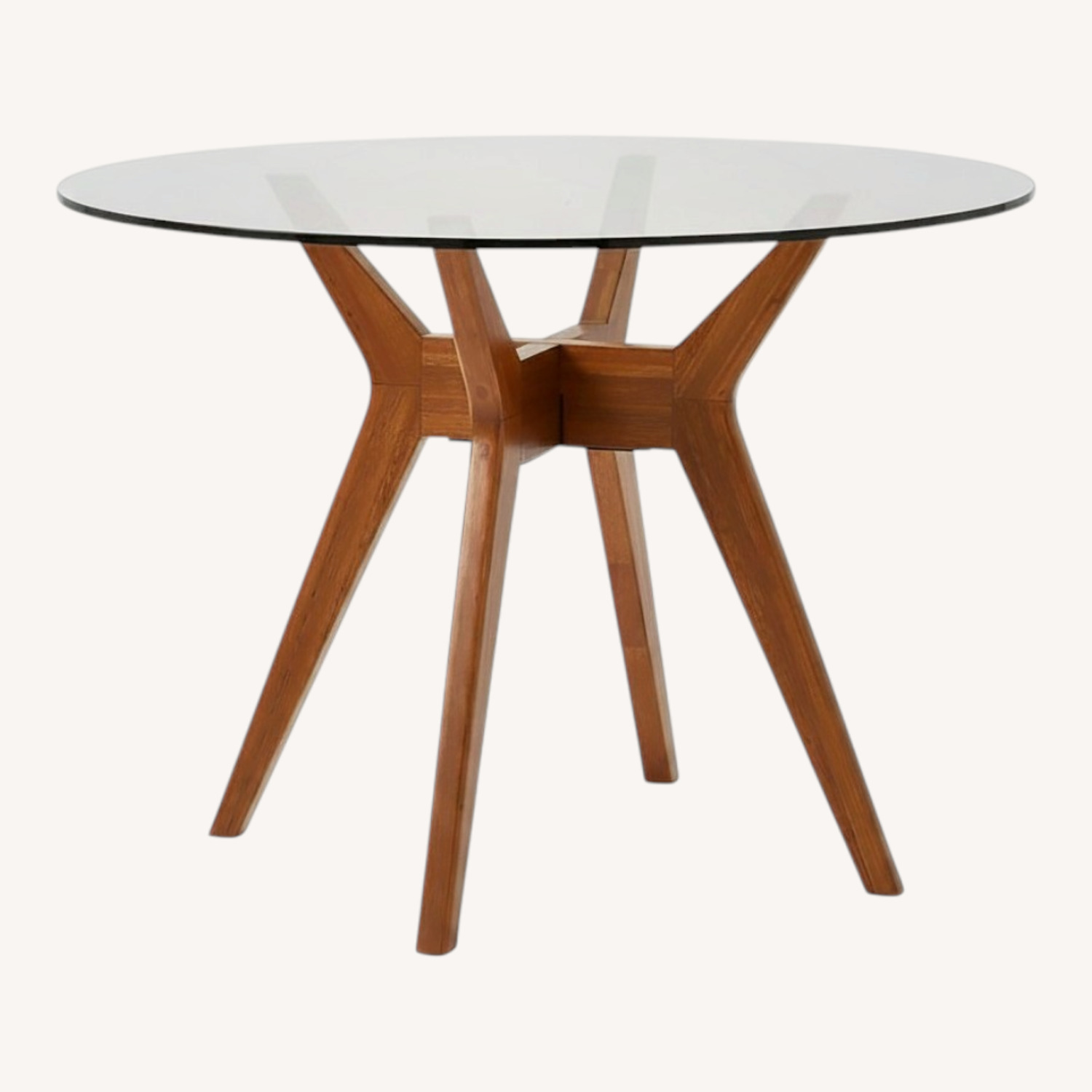 Seller's Notes:West Elm Jensen round glass dining table. Mid century modern style, in very good condition. No marks on the glass, the one wood support arm has a very minor gouge ( about an inch long) on the inside portion. Can’t be seen when sitting at the table or from side. I bought this table new from West Elm. It’s the perfect size for a small dining area or apt.
