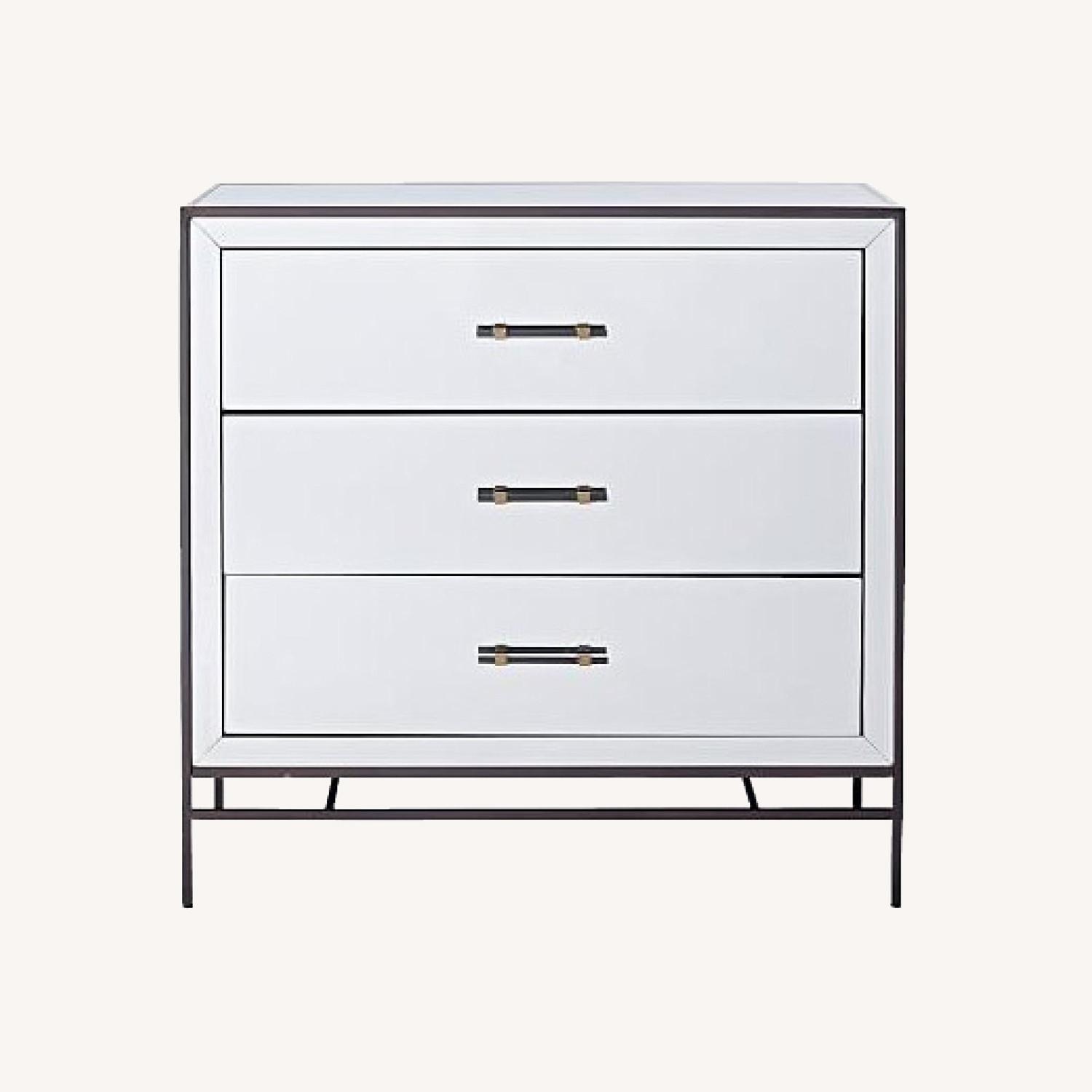 Seller's Notes:Stunning 3-drawer dresser with mirror-wrapped engineered wood and antique bronze-finished metal hardware