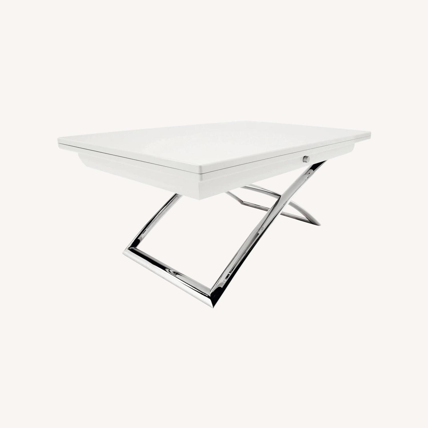 Seller's Notes:This sleek DAKOTA table is a versatile height adjustable coffee table which becomes a dining table in just a few seconds: just press the button on the metal under-frame to adjust it to one of the 7 heights available (from 14” to 30”). The 2 side extension leaves stored inside the under-frame slide out to create a 28” x 74” glossy white top, which can comfortably seat up to 6 people. In excellent condition.