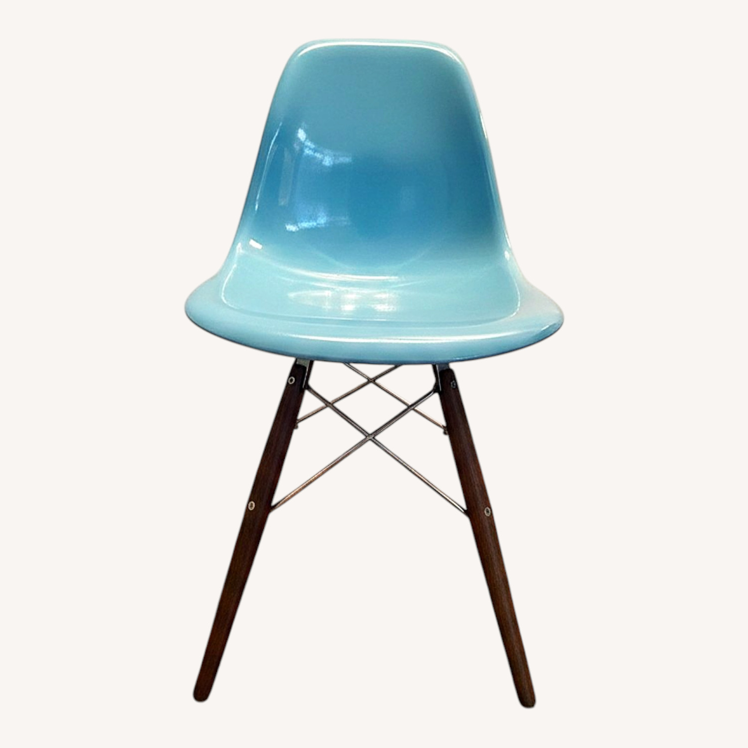 Seller's Notes:* Molded plastic shell (light blue) * Wood dowel legs (walnut or similar finish) * Metal cross-bracing (“Eiffel base”)