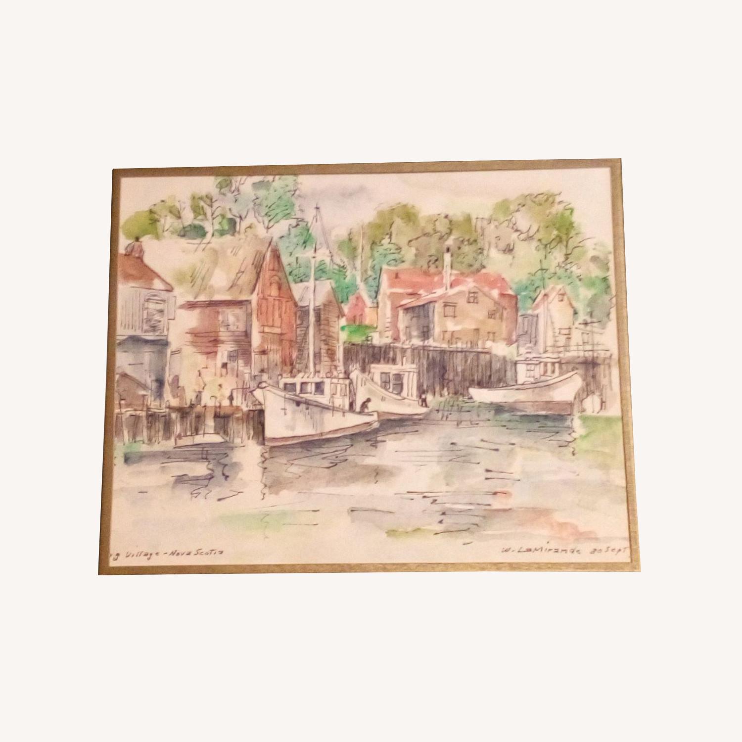 Seller's Notes:William LaMirande is a artist from "Skunk City " Syracusez NY". William LaMirande was a night watchman at General Electric. His art was not really discovered and apprecitae until after his passing in 1998. William LaMirande was a very talented artist whos work in now in a few gallery's around NY and some are even in Museum Collection Onondaga Historical Association. Known for his street paintings of landmark buildings. His paintings of places in Paris/France in watercolors and his ink and pencil sketchs/doodles of country scence's and 3 demecial. Often called fishbowl style and outsider style each piece is truly creative. 44 of his pieces of William LaMirande's art were found in a dumpster in Las Vegas . This watercolor has a stain on back of paper and came through slightly on the front right side above the trees but it really looks like its part of the painting and is not dark like on the back side. It is signed and dated and in the left corner on the bootom says fishing village in Nove Scotia. Very detailed and a great piece of art by William LaMirande. Each piece is origanal and one of a kind it comes is a matt photo cover ready to be put in a frame of your choice. His art can only increase in value as he becomes more well known.