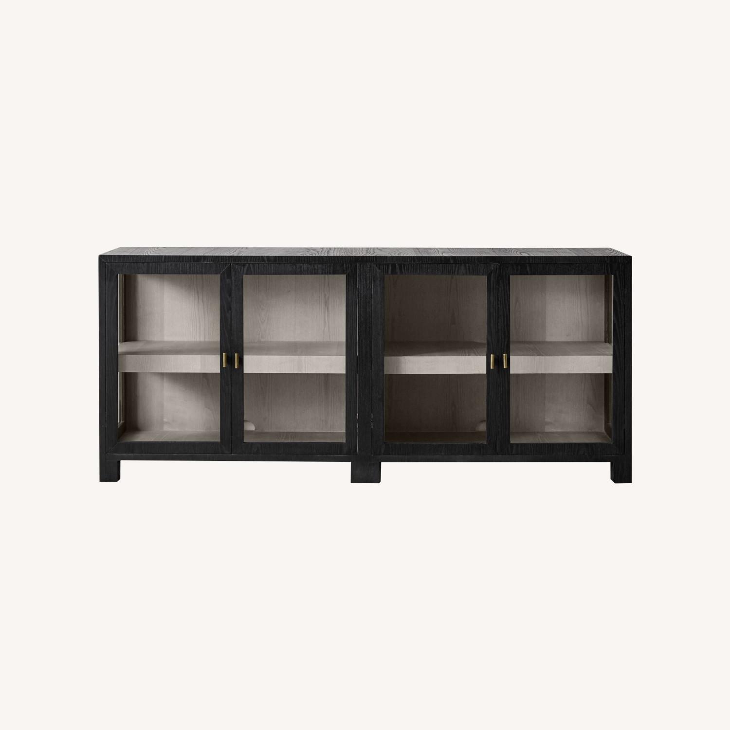 Seller's Notes:Built from richly grained ash, this modern media cabinet also serves as a stylish sideboard. The light interior adds fresh contrast to the ebonized finish, and the double doors and cord cutouts offer easy access and organization to media. Design Hand lacquered exterior with a smooth satin, protective black finish. Contrasting ash veneer interior with a light grey finish. Features slim polished nickel metal pulls. Two solid-wood shelves provide sturdy storage space. Half-moon shaped cord cutouts offer easy access and organization to media. Quality & Craftsmanship Built from richly grained, kiln-dried ash for enhanced strength. Double set of mitered doors with soft-close hinges. Double dowels and mortise-and-tenon joinery ensure strength and stability. Adjustable levers protect flooring and ensure balance on uneven surfaces. In-home furniture delivery with White Glove Service.
