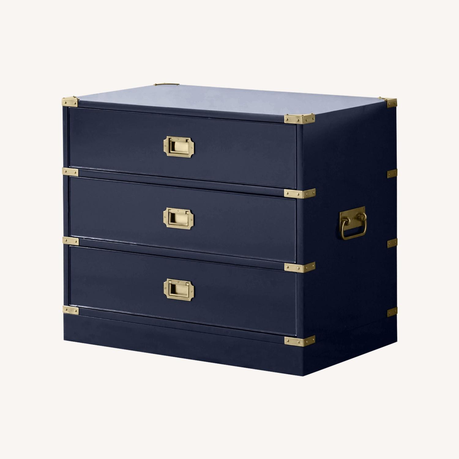 Seller's Notes:Our dramatically detailed dresser pairs solid stainless steel strapping and inset handles with smoothly lacquered wood. Three drawers make it a truly functional storage piece beside the bed or sofa. Designed by our team at our Williams Sonoma Home studio in San Francisco. Stainless steel hardware with antique brass finish. Color choices include navy or green. Spacious drawers have a smoothly lacquered interior. Collection includes a nightstand, side table and two dressers. Quality & Craftsmanship Handcrafted by skilled artisans. Built from sustainable materials, including kiln-dried engineered wood and poplar veneers. Drawers are reinforced with dovetail joinery for strength and stability. Feet are equipped with levelers to ensure stability on uneven surfaces. Made in a Fair Trade Certified™ factory. www.FairTradeCertified.org Anti-tip kit included: comes with safety-tested mounting hardware, instructions, and a nylon strap. To prevent injuries from furniture tip-over, this item should be securely fixed to the wall. In-home delivery with White Glove Service.