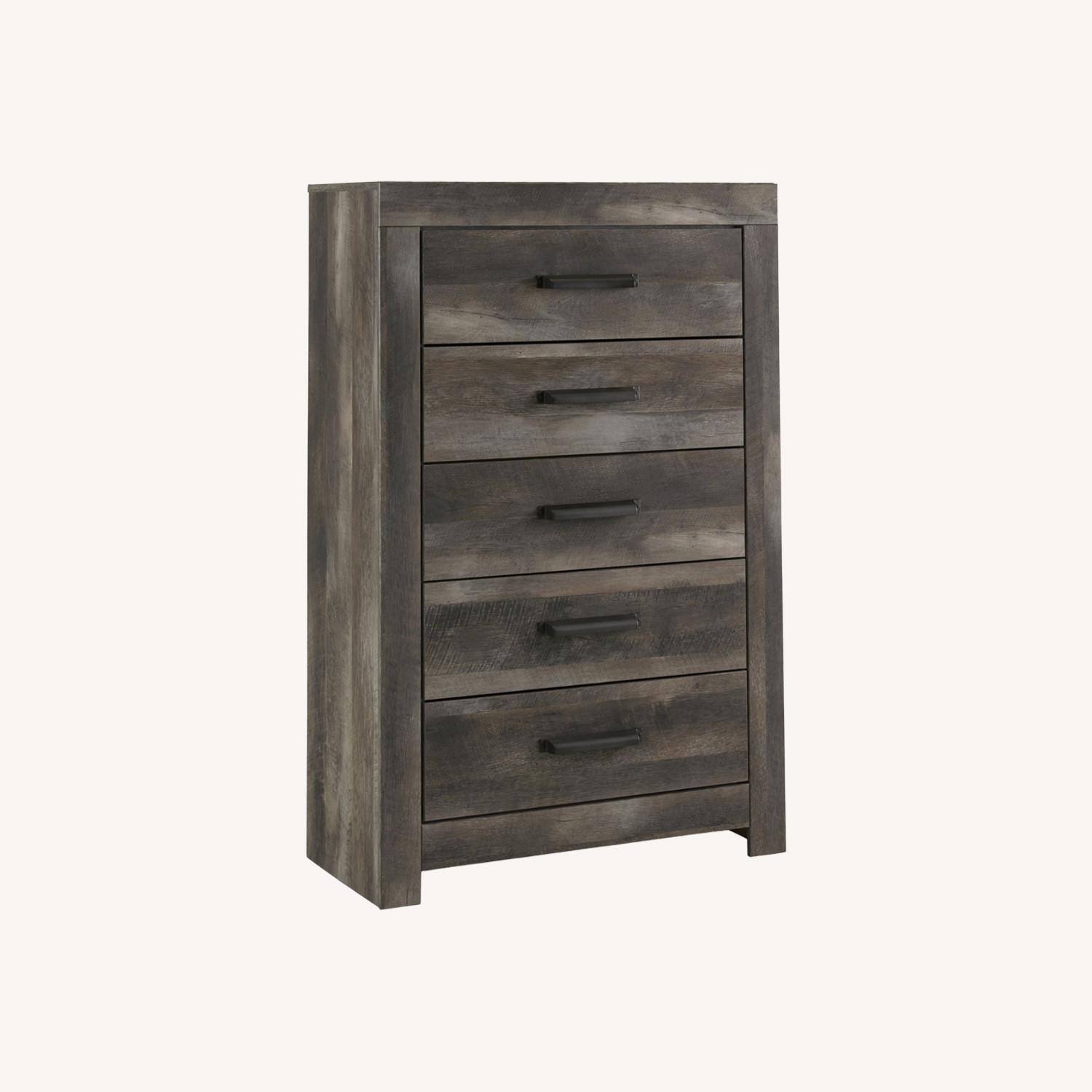 Seller's Notes:The Wynnlow chest of drawers is sure to win your heart with its daring designer take on modern rustic. The bedroom chest’s crisp, clean and minimalist-chic profile is enriched with a striking replicated oak grain with thick plank styling and a weathered gray finish for that much more authentic character. Large-scale hooded pulls gracing the flush-mount drawers add such a distinctive twist.